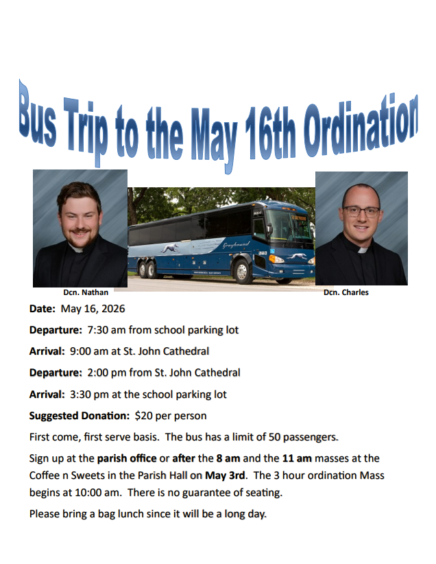 about Flocknote Signup, Ordination Bus, Seniors in Fellowship, School Enrollment, Called To Flourish, Parish Council